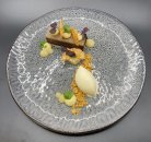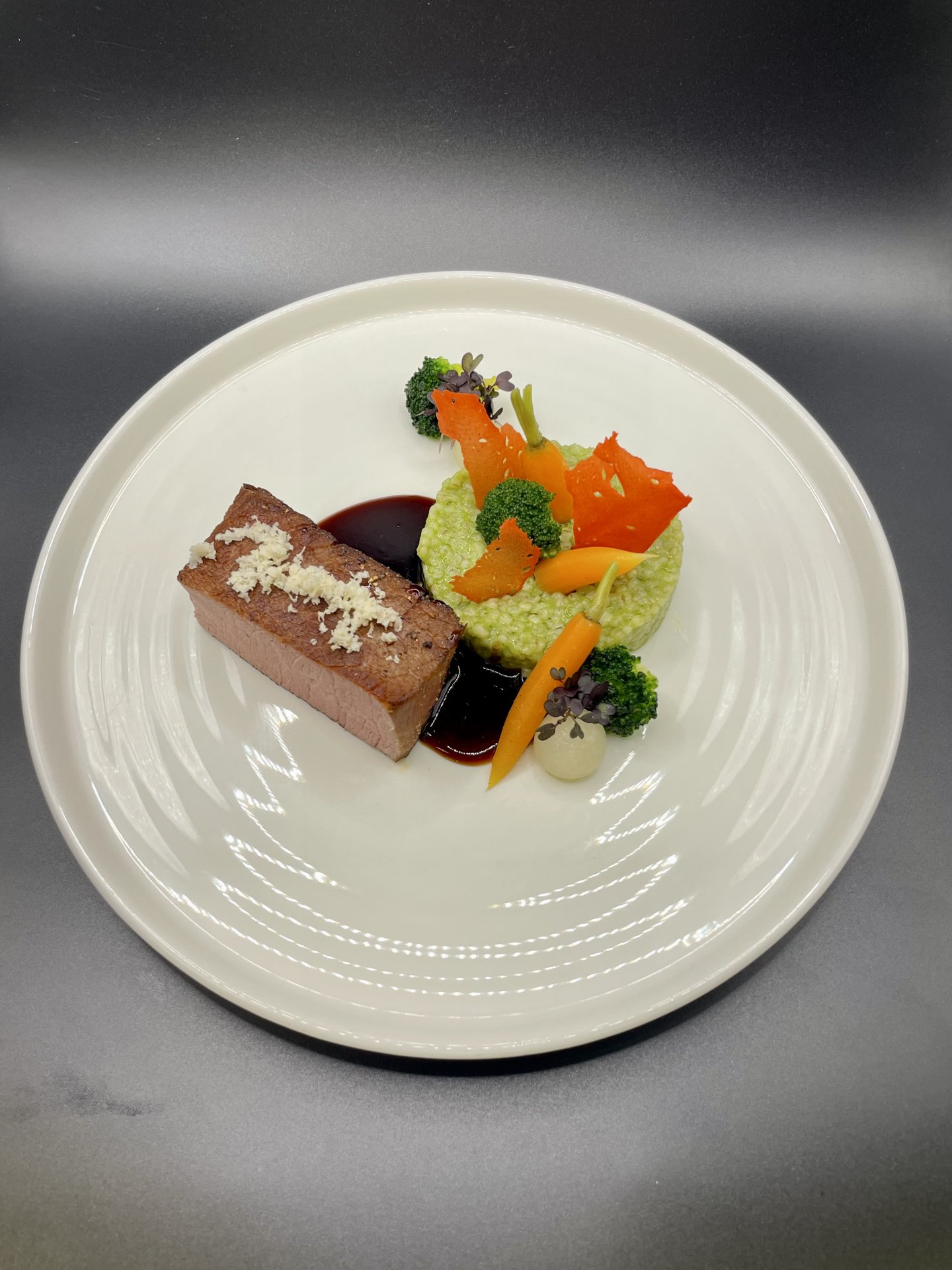 Huhn | Karotte | Erbse | Pilze | Schwarzwurzel | Krosser Reis | Yuzu | Jus